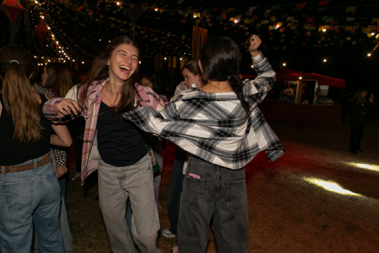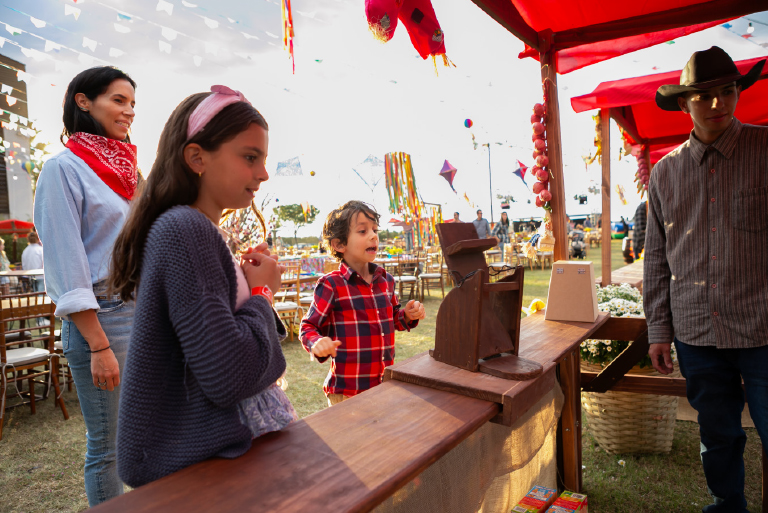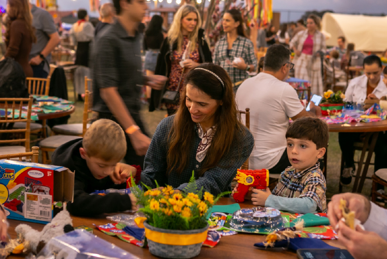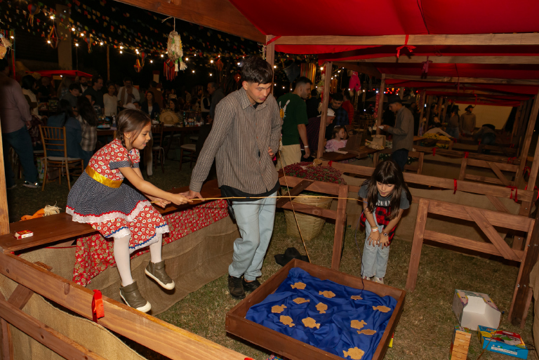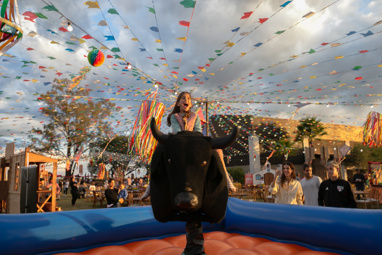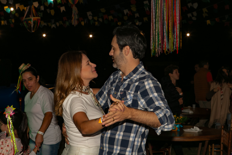 O arraiá foi pensado para encantar todas as idades. A adrenalina tomou conta dos participantes com o touro mecânico, enquanto as barracas de pescaria e jogo de argolas garantiram a diversão da garotada. Para aquecer a noite, uma grande fogueira crepitava ao som de música ao vivo, criando o cenário perfeito para confraternizar.